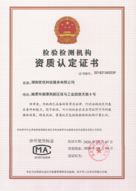 2020年9月,世優(yōu)科服已順利取得了由湖南省市場(chǎng)監(jiān)督管理局頒發(fā)的檢驗(yàn)檢測(cè)機(jī)構(gòu)資質(zhì)認(rèn)定證書(shū)(證書(shū)編號(hào)201821342039),標(biāo)志著公司在技術(shù)能力和質(zhì)量管理方面都達(dá)到RB/T214-2017《檢驗(yàn)檢測(cè)機(jī)構(gòu)資質(zhì)認(rèn)定能力評(píng)價(jià)檢驗(yàn)檢測(cè)機(jī)構(gòu)通用要求》的要求。